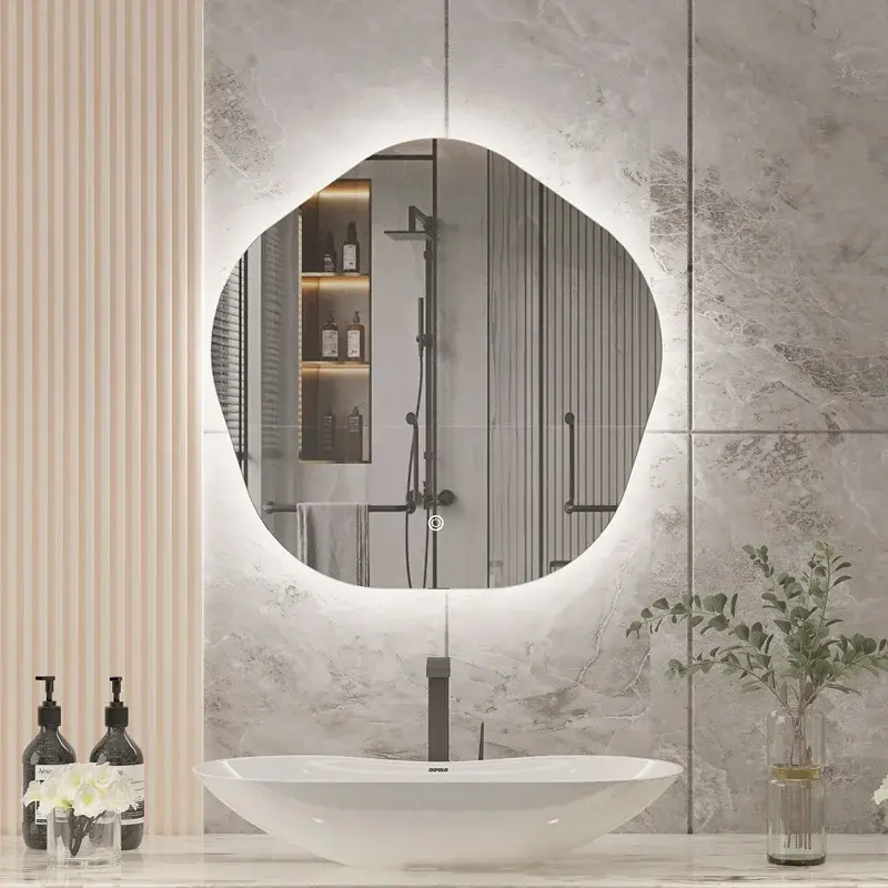 Aeroma mirror with geometric LED lighting. Integrated magnifying mirror and anti-fog function, size: 100*70 cm.