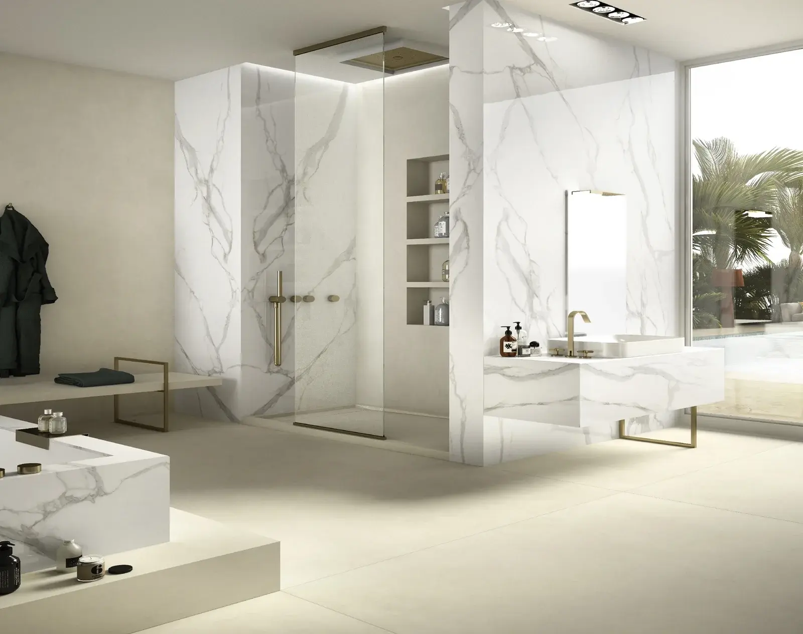 Large format porcelain slab Infinity Calacatta Oro. White marble with gold veins, glossy surface. Size: 160*320 cm, MB06.