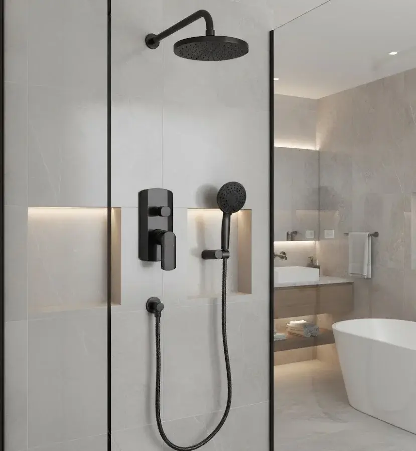 Shower system Empolo with bath tap. Glossy copper surface, round rain head and hand shower.