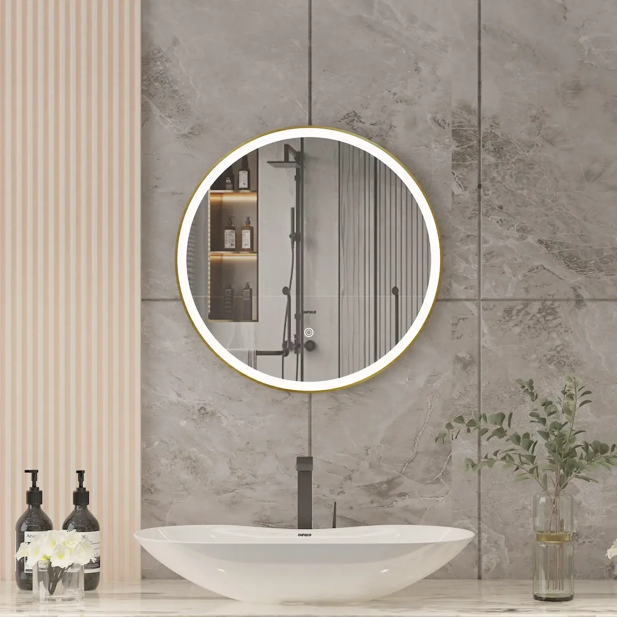 სარკე Aeroma გეომეტრიული LED განათებით. ინტეგრირებული გამადიდებელი სარკით და ანტი-ორთქლის ფუნქციით, ზომა: 100*70 სმ.