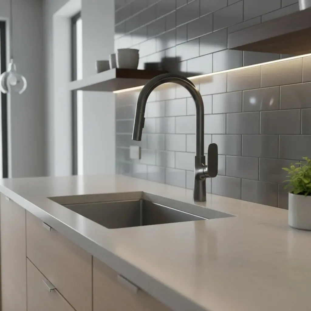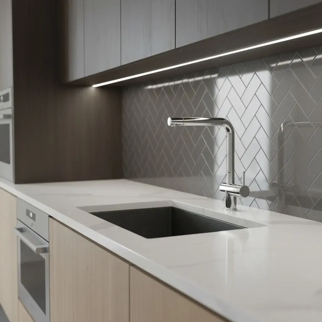 Kitchen tap Empolo. Brushed gold, modernist L-shaped design and high spout.