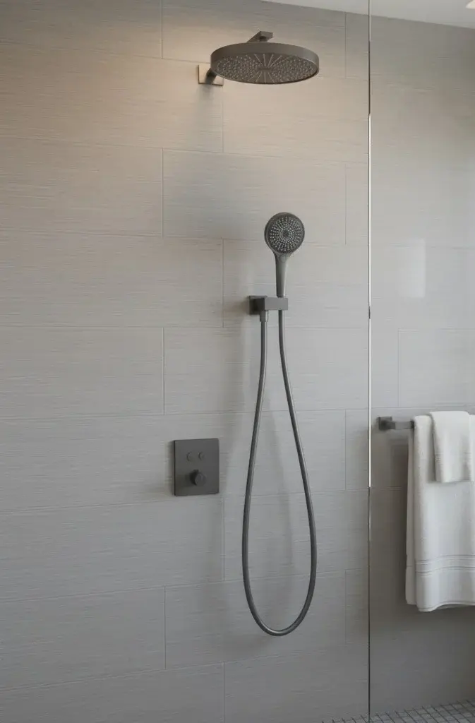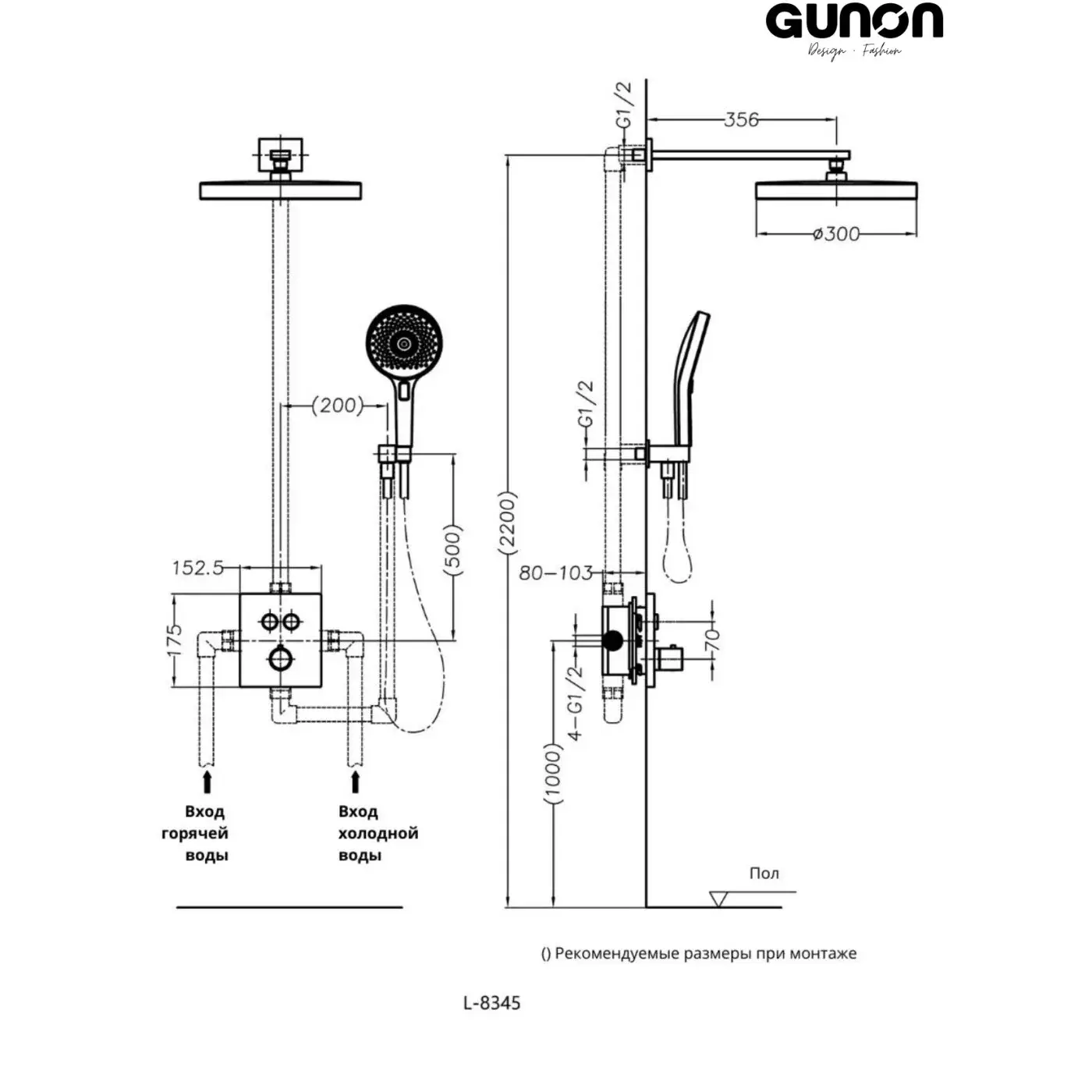 Душевая система Gunon, термостатическая, с круглой душевой лейкой и ручным душем, литой металлический корпус.