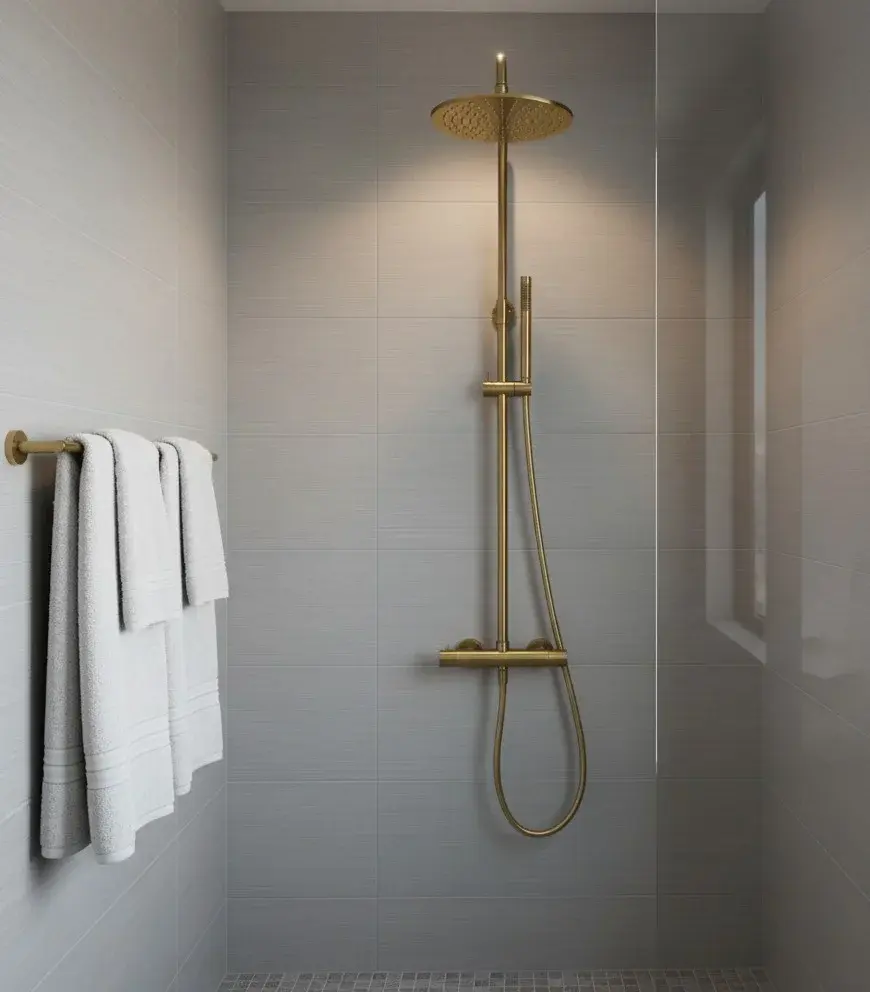 Душевая система Gunon, термостатическая, с круглой душевой лейкой и длинным ручным душем, матовая медь.